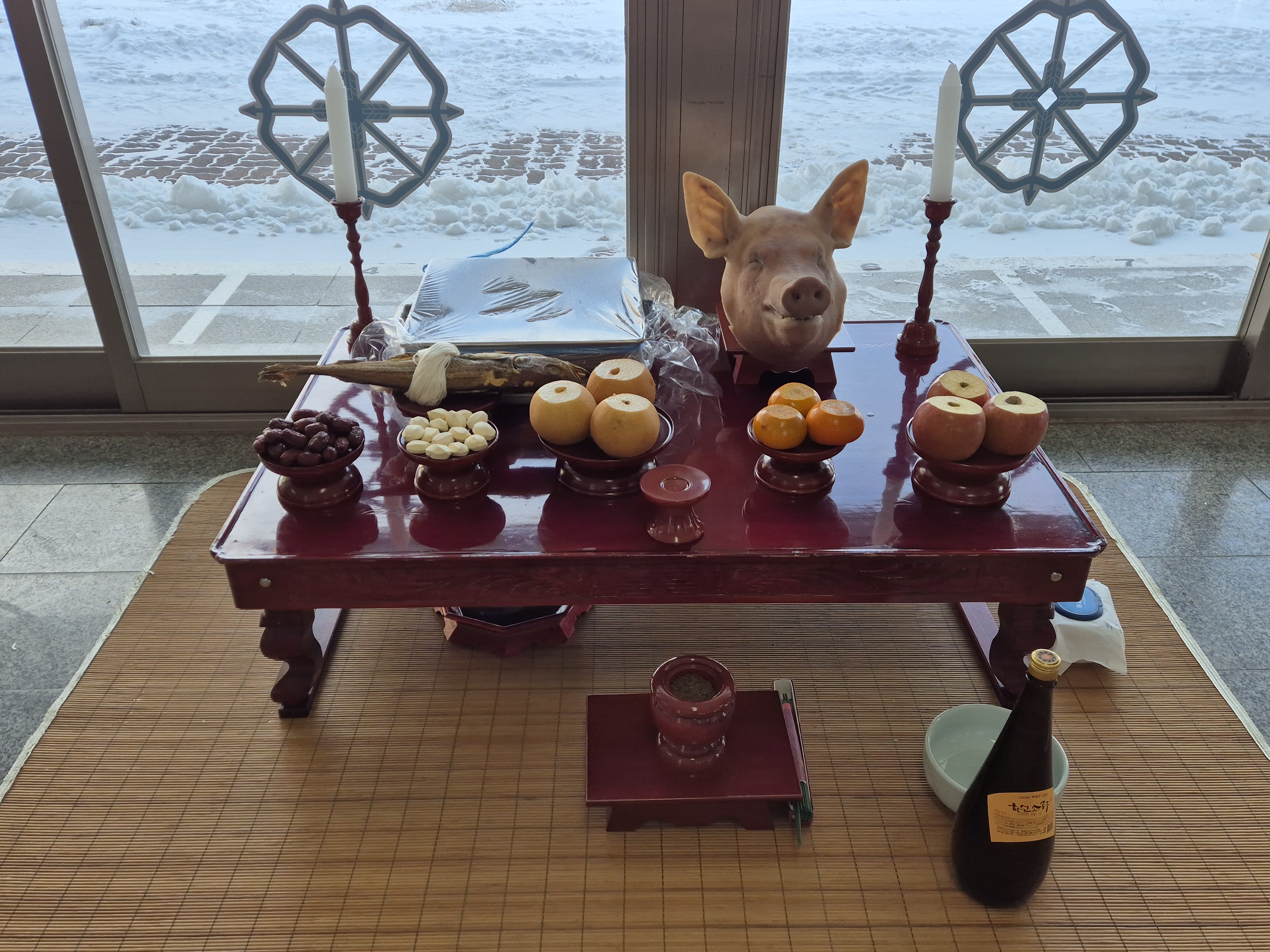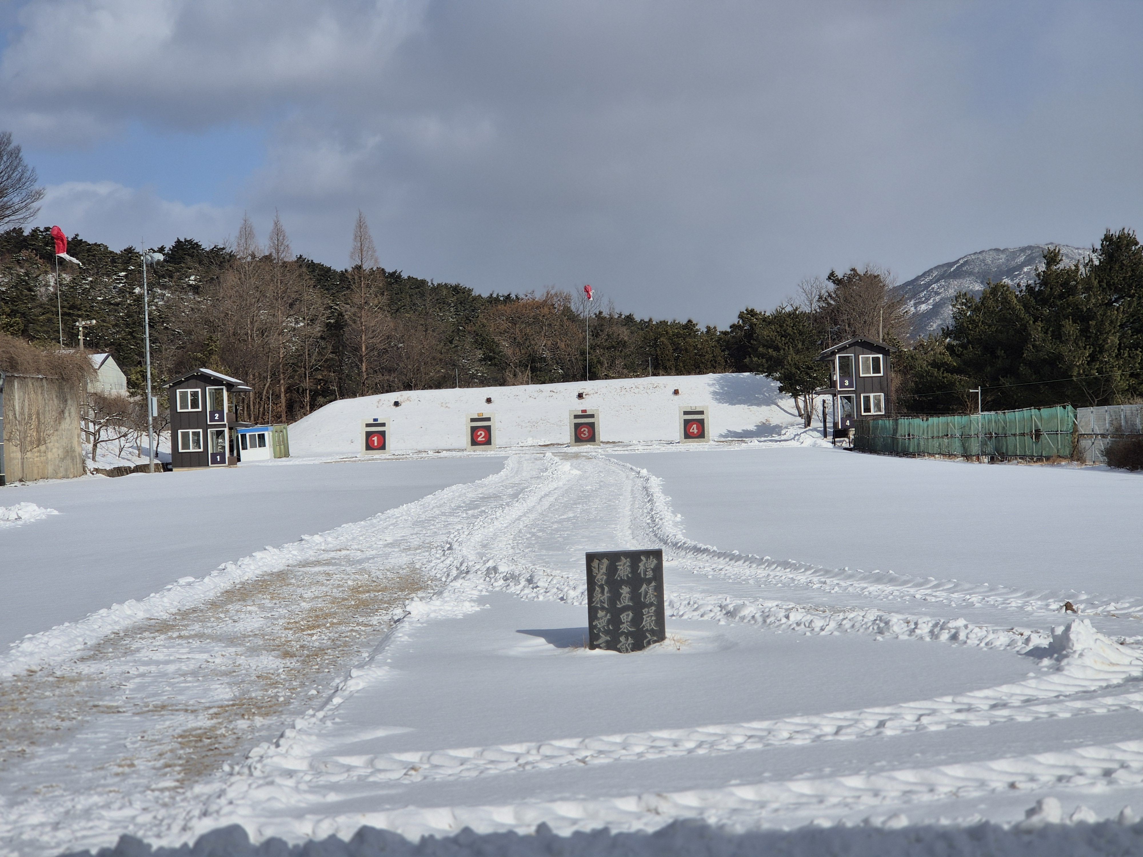 활터는 눈으로 뒤덮혔고 이미 과녁제를 준비중이다.